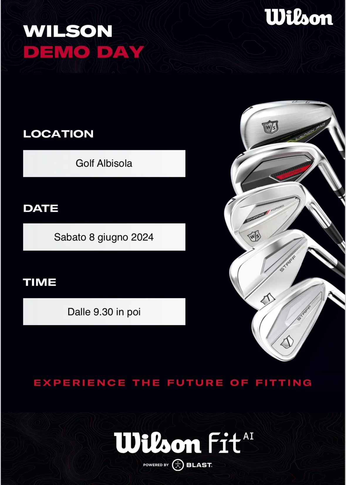 Wilson Demo Day sabato 8 giugno 2024 9:00 AM 2:00 PM 09:00 14:00 GOLF CLUB ALBISOLA Via Riccardo Poggi snc Albisola Superiore, 17011 Italy (Visualizza la mappa) Google Calendar ICS Fitting:1h 50€ (Sacca completa)30min 30€ (Solo ferri o legni)